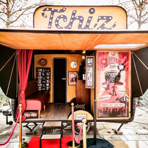 Découvrez LA TCHIZ MOBILE ! Véritable caravane photo ouverte sur tout un pan latéral, elle offre une vue imprenable sur son intérieur décoré avec le plus grand soin : Une banquette rétro confortable attend vos invités pour une expérience unique. Ils se prendront en photo devant une TV des années 1950 et repartiront avec leur photo. Un voyage qu’il ne sont pas prêt d’oublier !